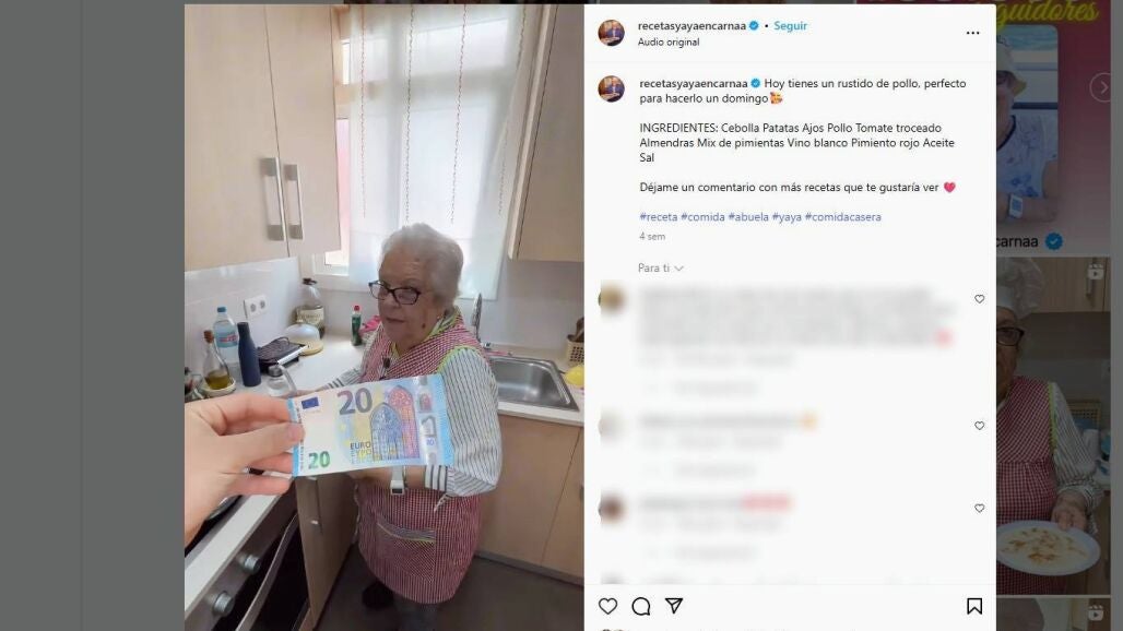 En uno de sus últimos vídeos, su nieto reta a Encarna a preparar una comida por menos de 20 euros. Ella acepta el reto "A ver que puedo hacer" ya en el supermercado compra los ingredientes, Cebollas, patatas, ajos, pollo, tomate troceado, almendras, mix de pimienta, vino blanco, pimiento rojo, aceite y sal.