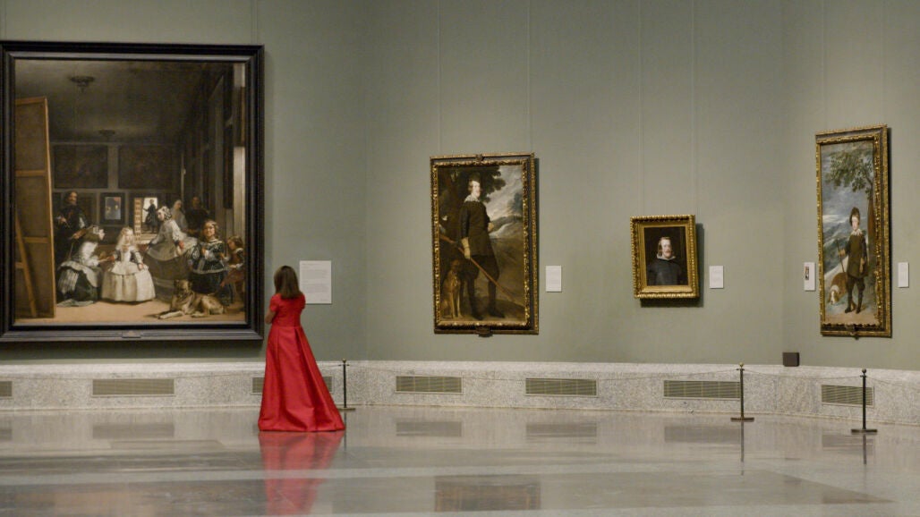 Con un vestido abrigo en rojo intenso, de manga corta y el cabello suelto, la intérprete ha estado rodeada en la Galería Central de uno de los cuadros más representativos del museo, Las Meninas de Diego Velázquez.